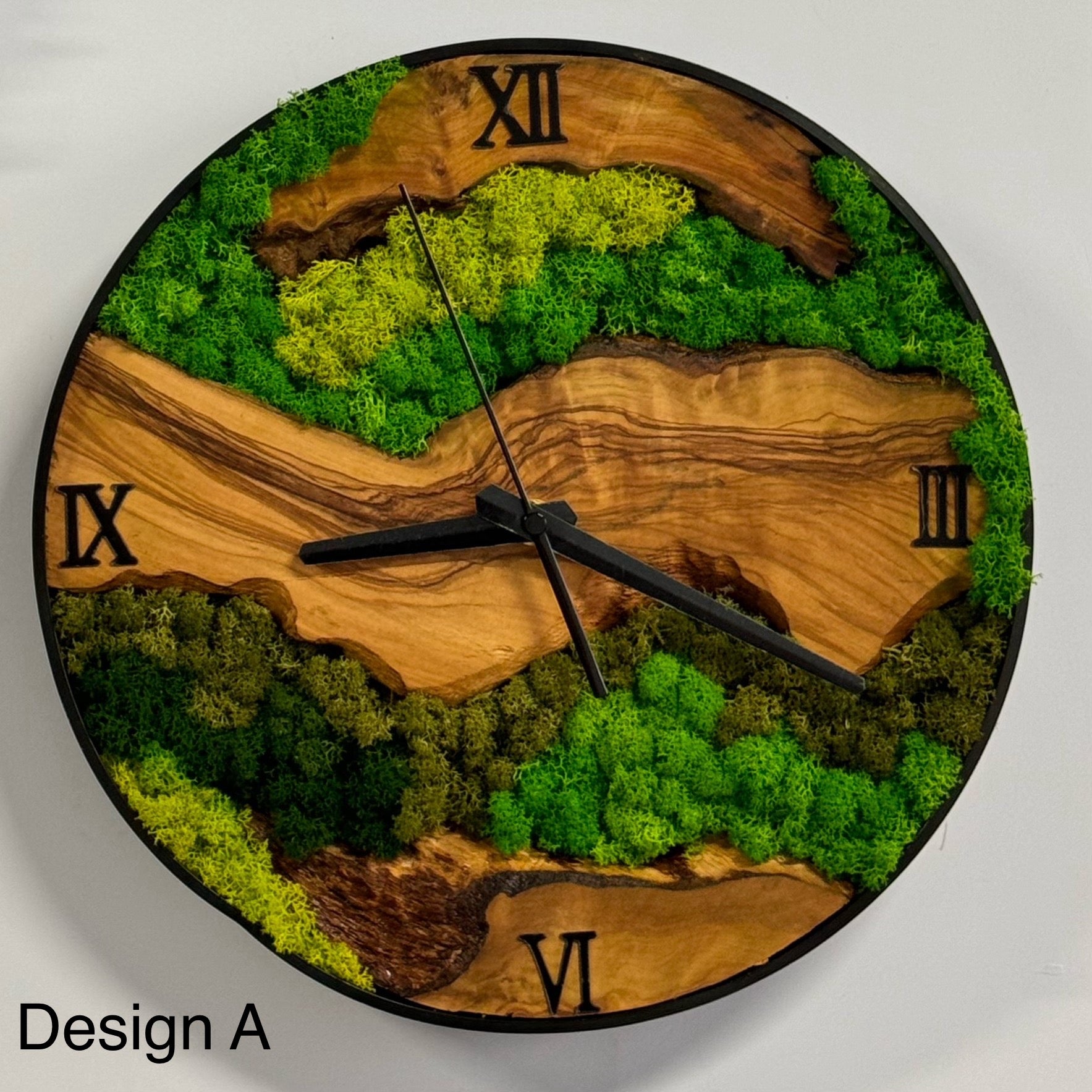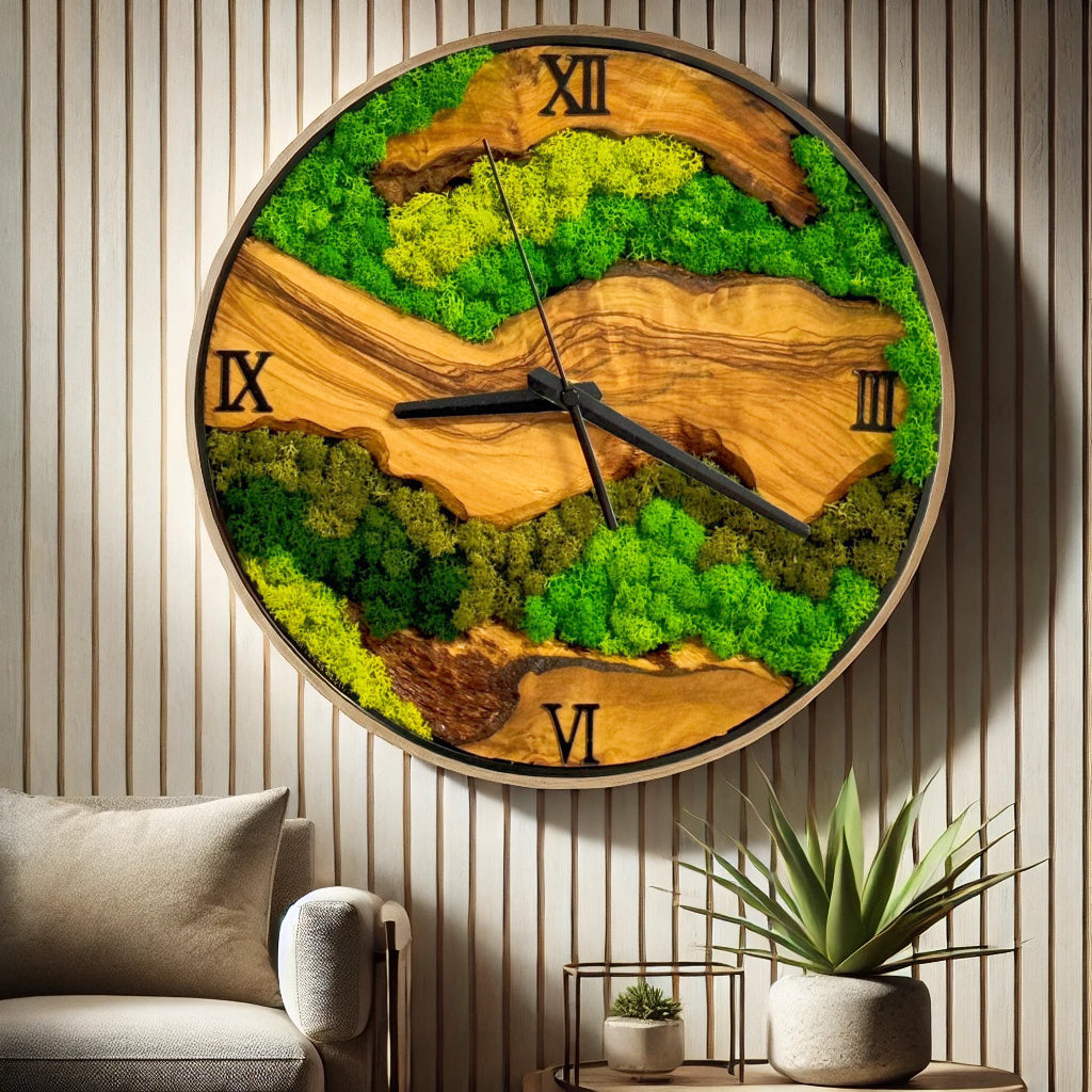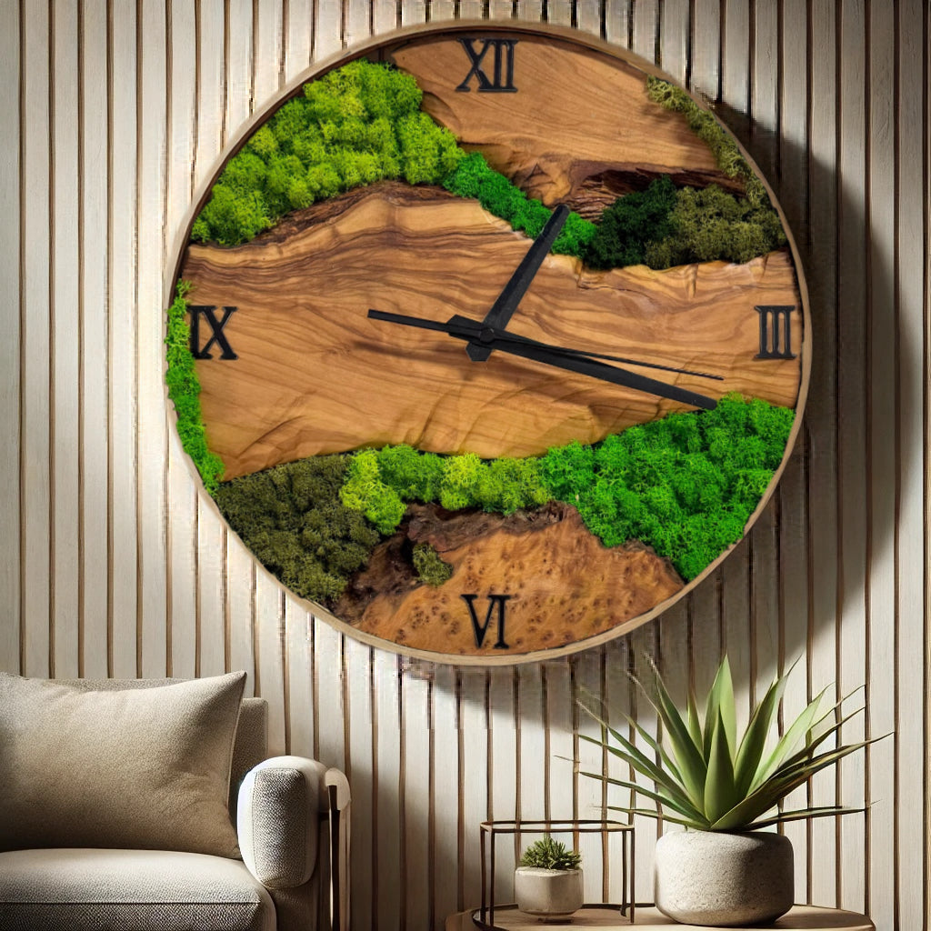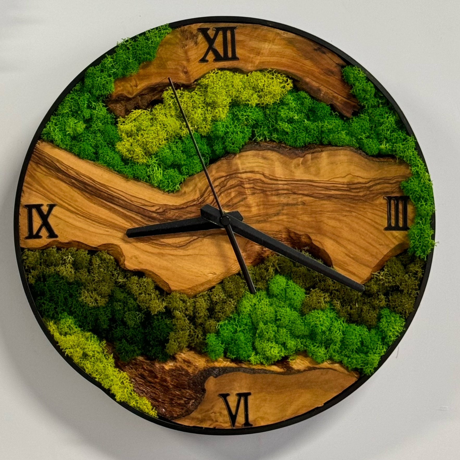 - Natural Elegance: Made entirely from natural materials, this clock combines the organic texture of olive wood or fragrant cedar wood with the vibrant look of preserved moss.